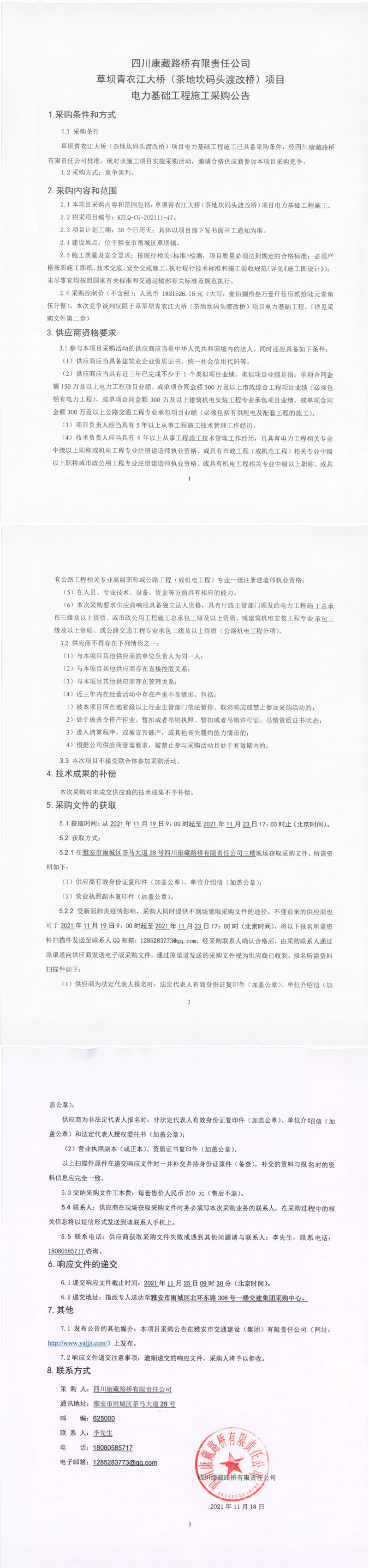 四川康藏路橋有限責(zé)任公司草壩青衣江大橋(茶地坎碼頭渡改橋)項目電力基礎(chǔ)工程施工采購公告
