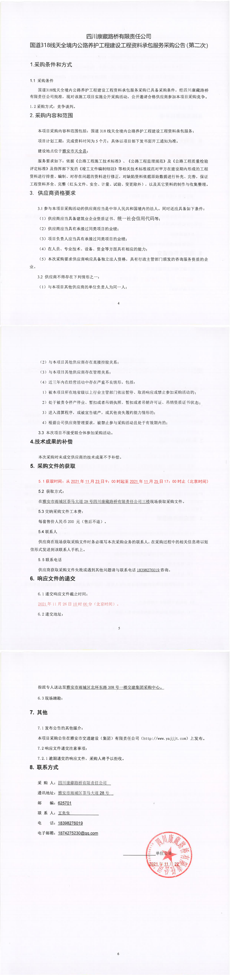 四川康藏路橋有限責任公司國道318線天全境內公路養(yǎng)護工程建設工程資料承包服務采購公告(第二次)