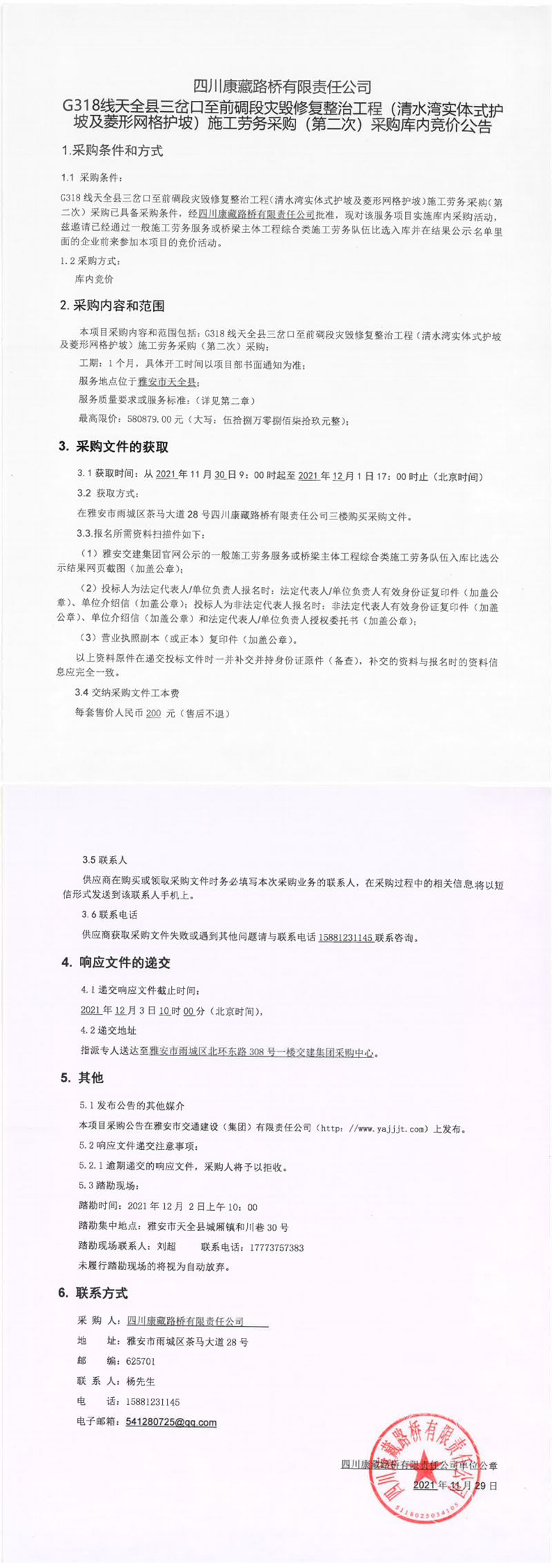 四川康藏路橋有限責(zé)任公司G318線天全縣三岔口至前碉段災(zāi)毀修復(fù)整治工程(清水灣實體式護(hù)坡及菱形網(wǎng)護(hù)坡)施工勞務(wù)采購(第二次)采購庫內(nèi)競價公告