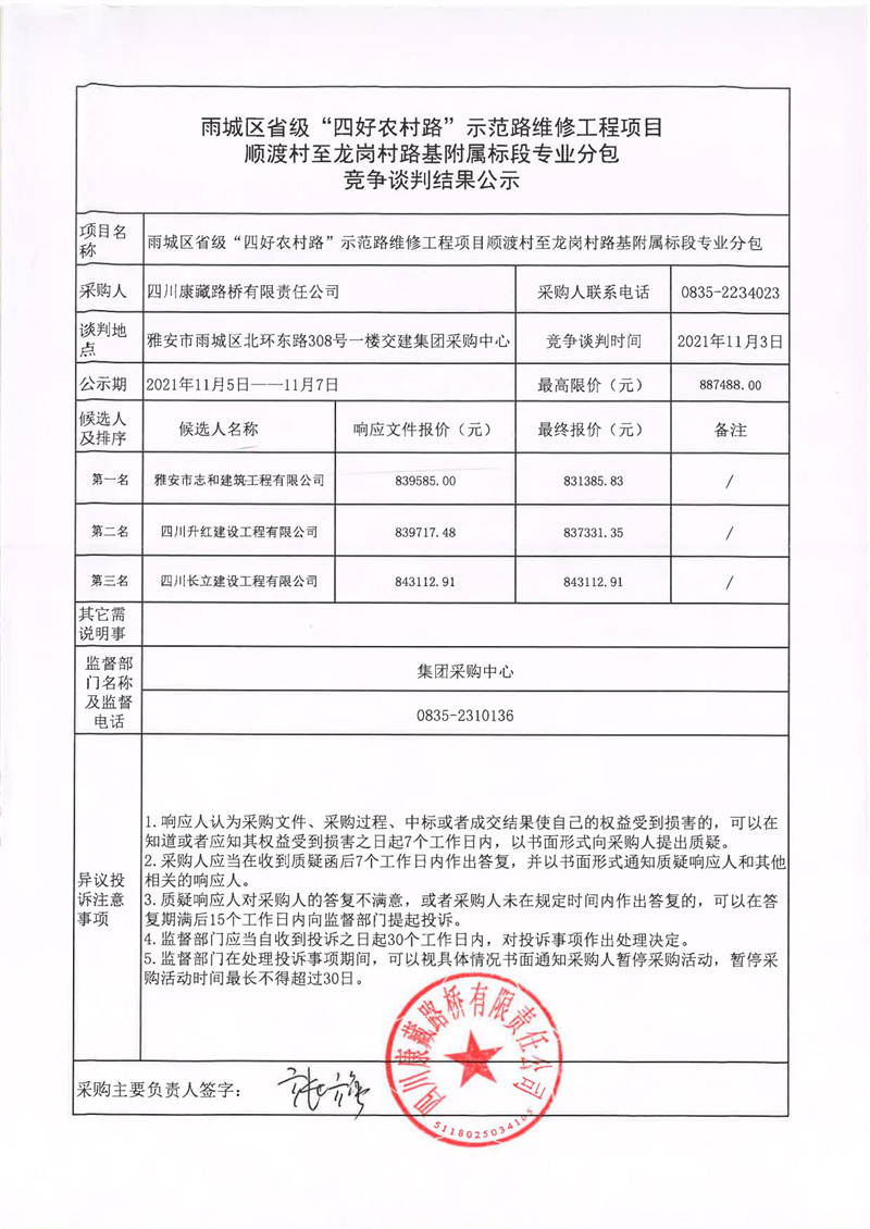 四川康藏路橋有限責(zé)任公司雨城區(qū)省級(jí)“四好農(nóng)村路”示范路維修工程項(xiàng)目順渡村至龍崗村路基附屬標(biāo)段專業(yè)分包競爭談判結(jié)果公示