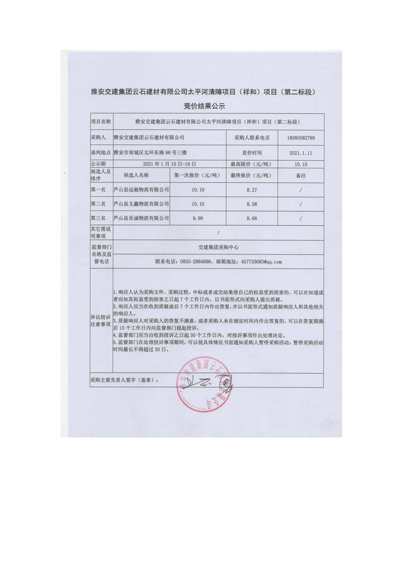 雅安交建集團云石建材有限公司太平河清障項目(祥和)項目(第二標段)競價結(jié)果公示