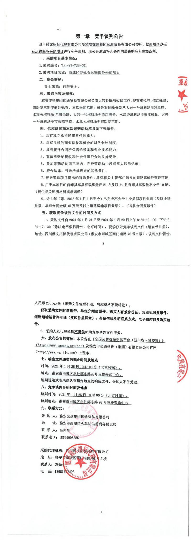 雅安交建集團(tuán)運(yùn)通貿(mào)易有限公司雨城區(qū)砂礫石運(yùn)輸服務(wù)采購項目競爭談判公告