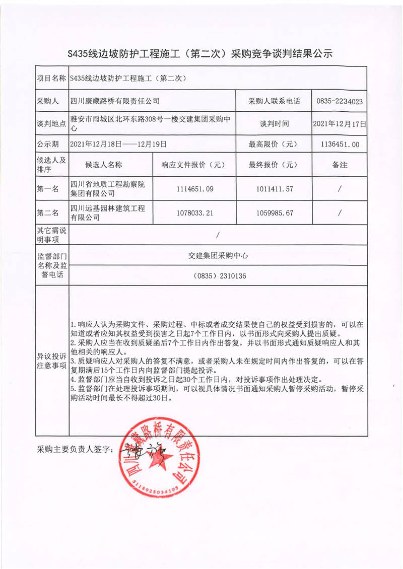 四川康藏路橋有限責(zé)任公司S435線邊坡防護(hù)工程施工(第二次)采購競(jìng)爭(zhēng)談判結(jié)果公示