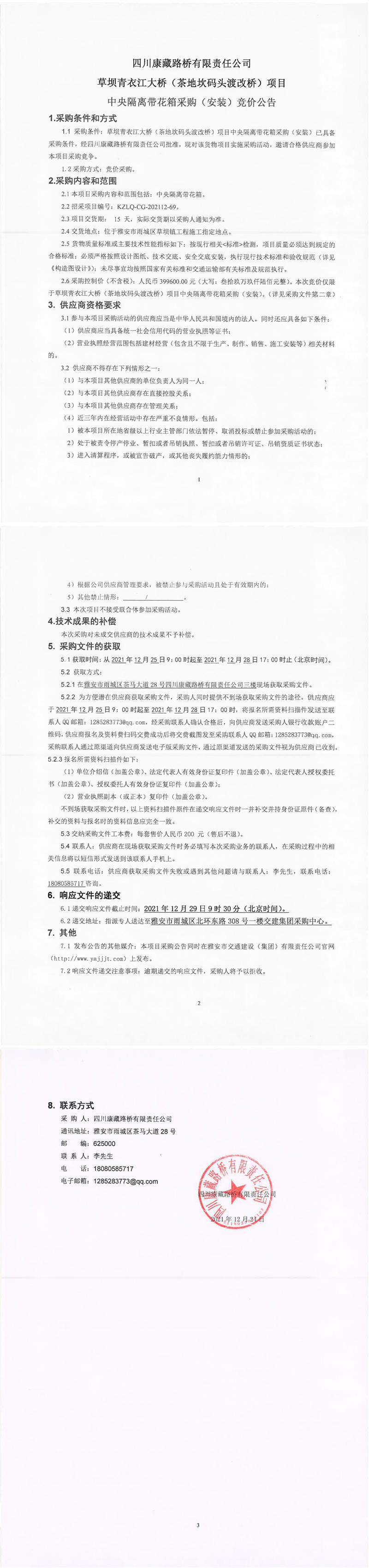 四川康藏路橋有限責任公司草壩青衣江大橋(茶地坎碼頭渡改橋)項目中央隔離帶花箱采購(安裝)競價公告
