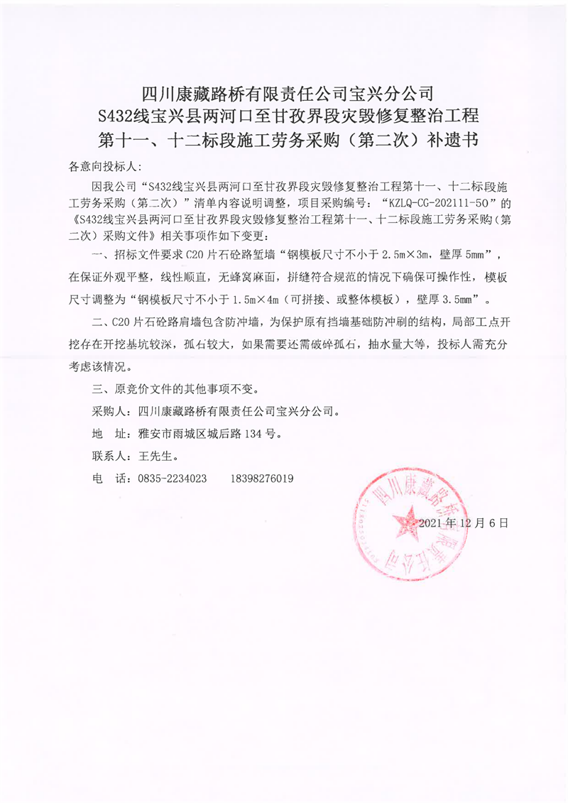 四川康藏路橋有限責(zé)任公司S432線寶興縣兩河口至甘孜界段災(zāi)毀修復(fù)整治工程第十一、十二標(biāo)段施工勞務(wù)采購(第二次)補(bǔ)遺書