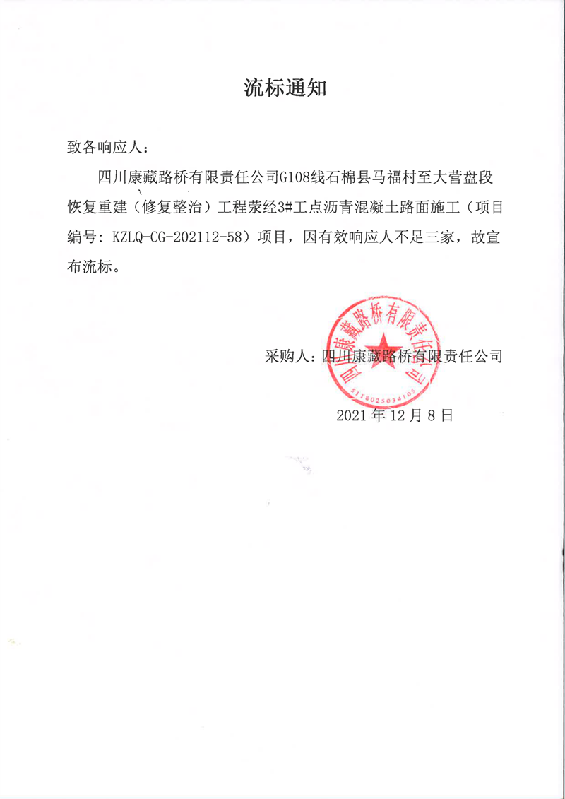 四川康藏路橋有限責(zé)任公司G108線石棉縣馬福村至大營盤段恢復(fù)重建(修復(fù)整治)工程滎經(jīng)3#工點瀝青混凝土路面施工流標通知