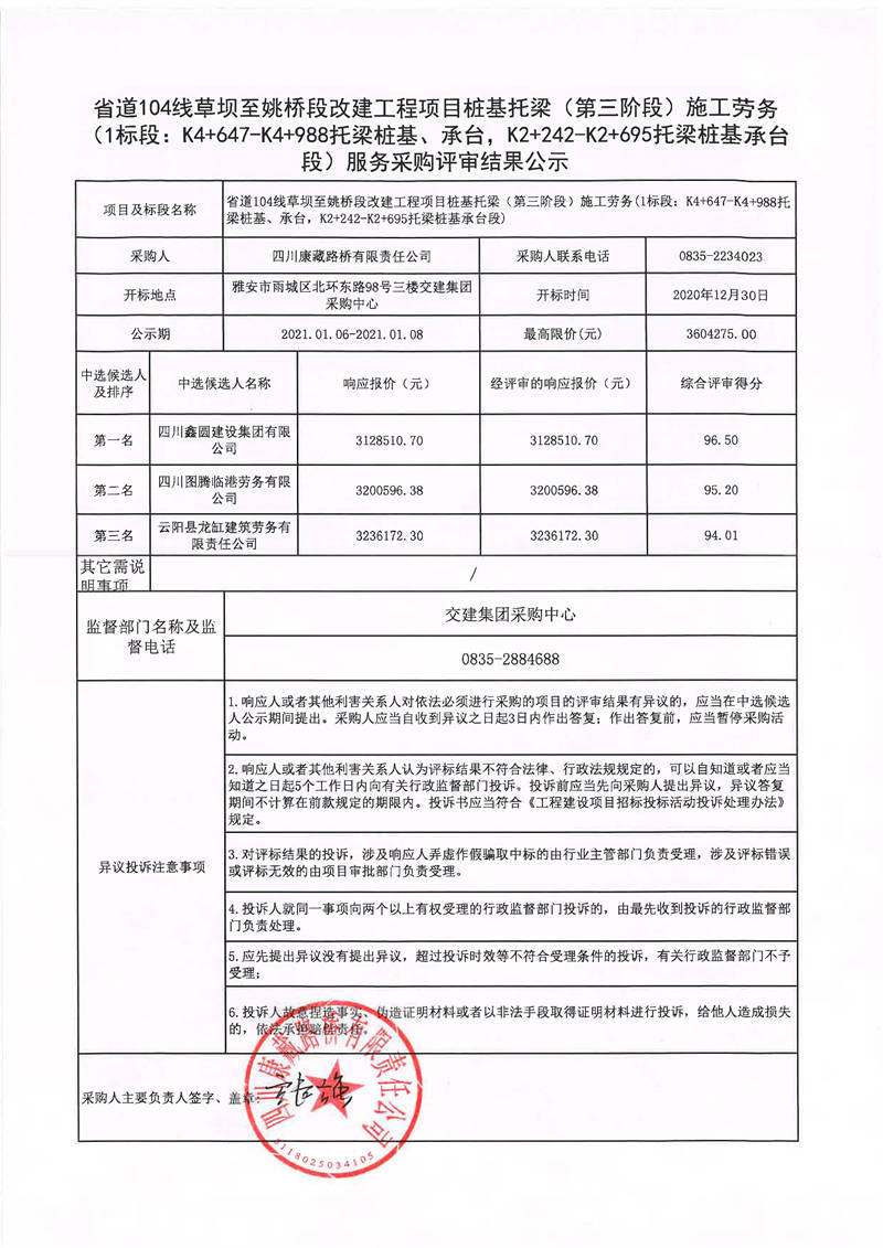 四川康藏路橋有限責(zé)任公司省道104線(xiàn)草壩至姚橋段改建工程項(xiàng)目樁基托梁(第三階段)施工勞務(wù)服務(wù)1標(biāo)段采購(gòu)評(píng)審結(jié)果公示