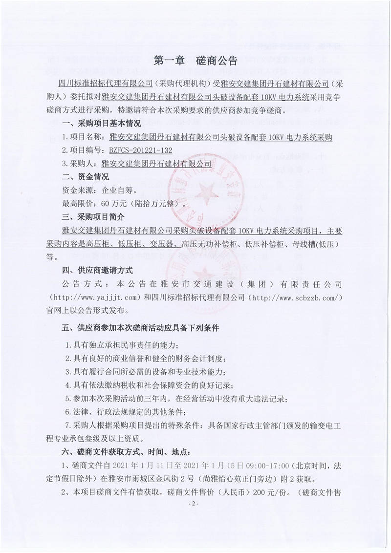 雅安交建集團丹石建材有限公司頭破設備配套10KV電力系統(tǒng)競爭磋商公告