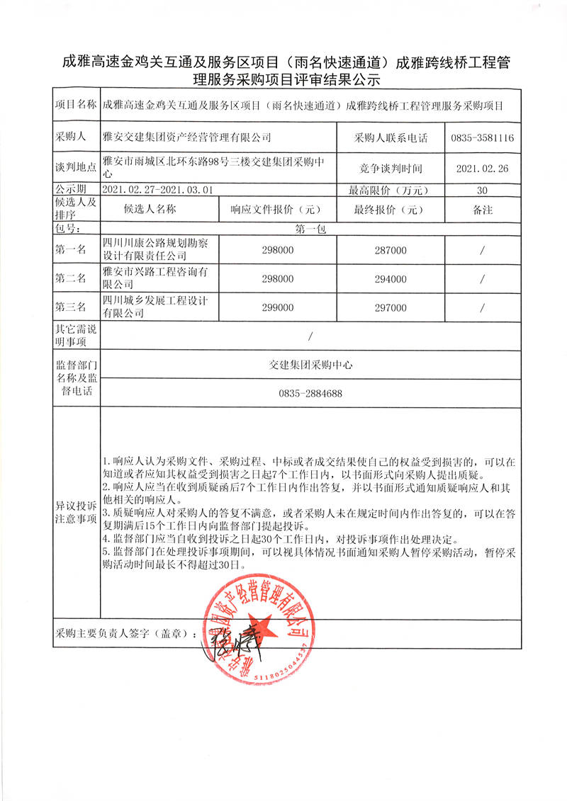 雅安交建集團資產(chǎn)經(jīng)營管理有限公司成雅高速金雞關互通及服務區(qū)項目(雨名快速通道)成雅跨線橋工程管理服務采購項目評審結果公示