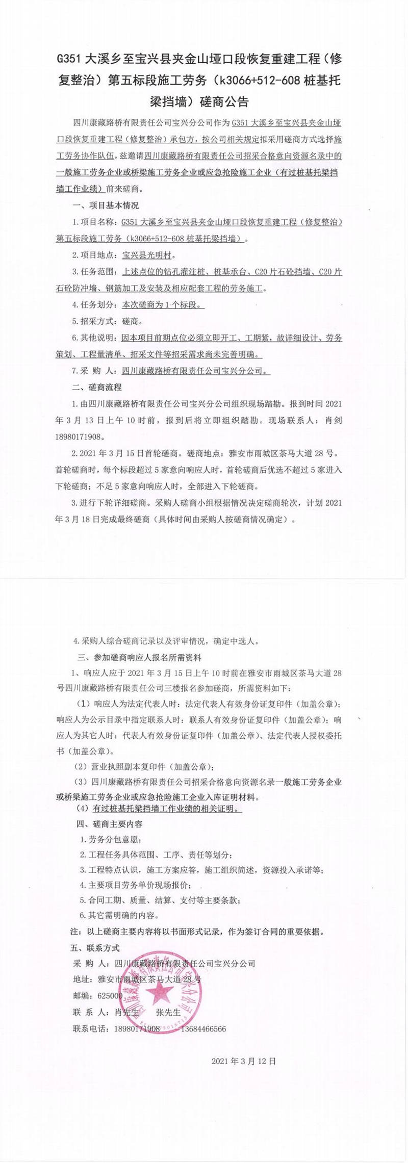 四川康藏路橋有限責任公司寶興分公司G351大溪鄉(xiāng)至寶興縣夾金山埡口段恢復重建工程(修復整治)第五標段施工勞務(wù)(k3066+512-608樁基托梁擋墻)磋商公告