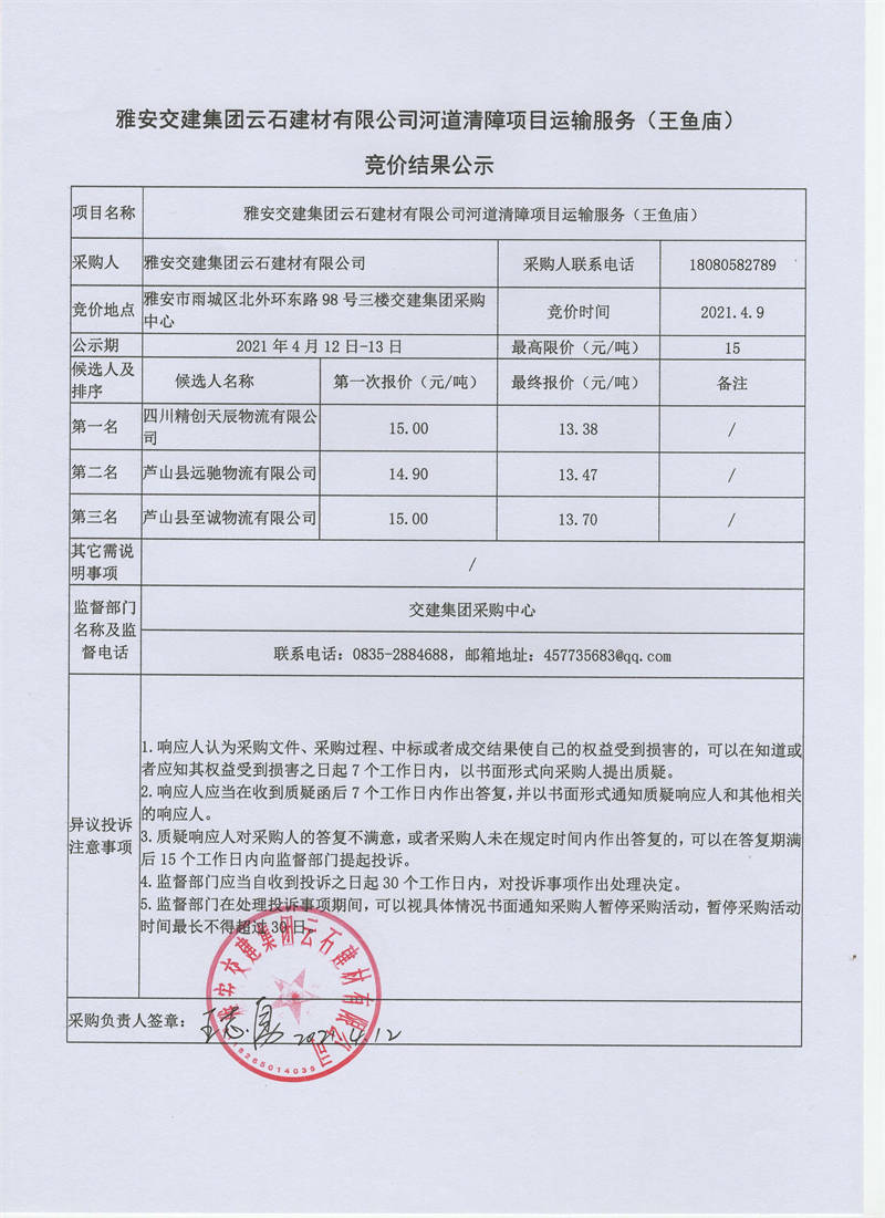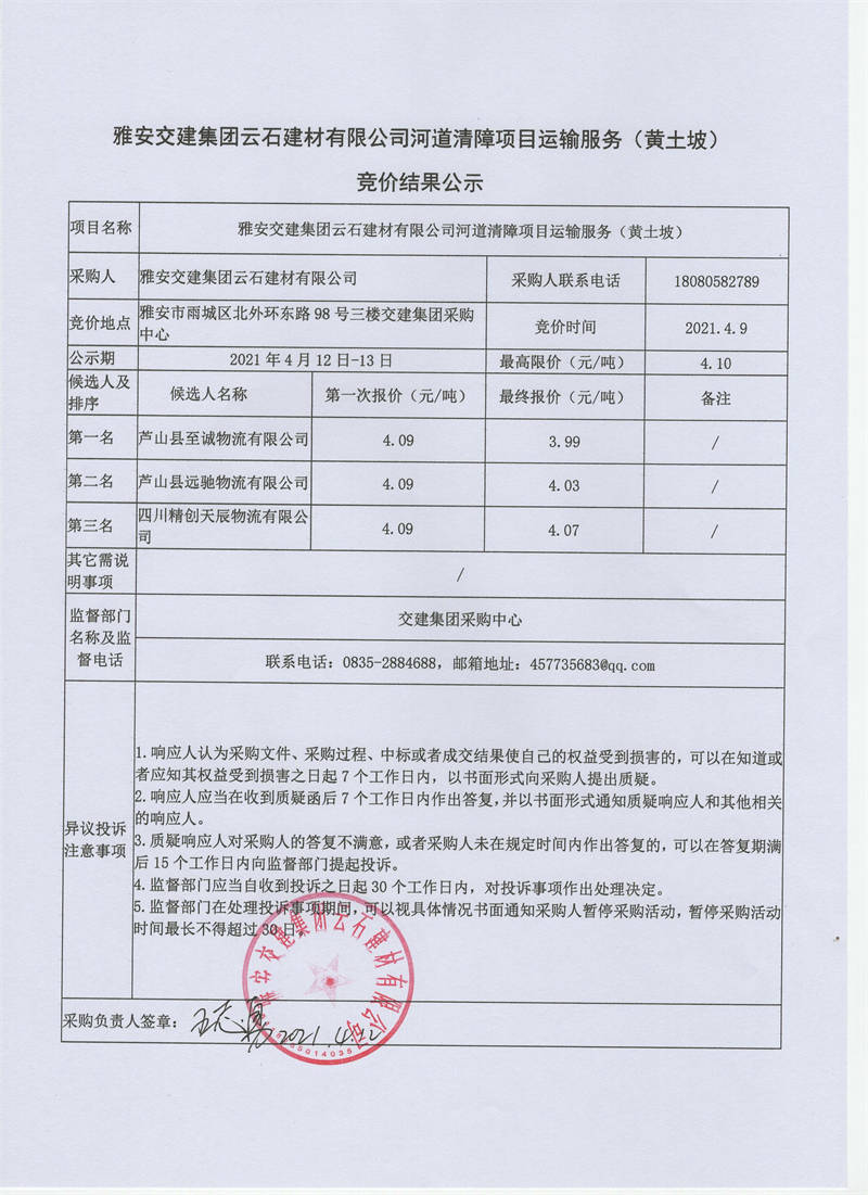 雅安交建集團云石建材有限公司河道清障項目運輸服務競價結(jié)果公示