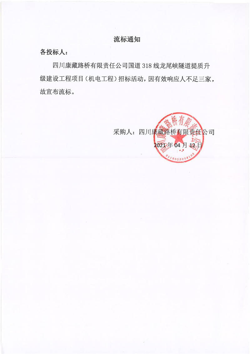 四川康藏路橋有限責(zé)任公司國道318線龍尾峽隧道提質(zhì)升級建設(shè)工程項目(機電工程)流標(biāo)通知