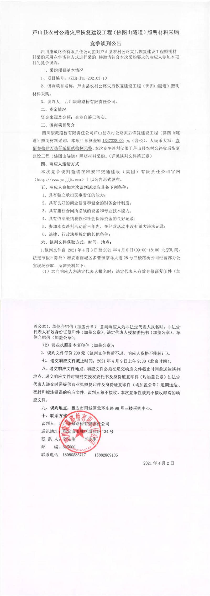四川康藏路橋有限責(zé)任公司蘆山縣農(nóng)村公路災(zāi)后恢復(fù)建設(shè)工程(佛圖山隧道)照明材料采購(gòu)競(jìng)爭(zhēng)談判公告