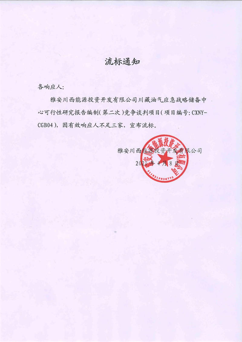 雅安川西能源投資開(kāi)發(fā)有限公司川藏油氣應(yīng)急戰(zhàn)略儲(chǔ)備中心可行性研究報(bào)告編制(第二次)競(jìng)爭(zhēng)談判項(xiàng)目流標(biāo)通知