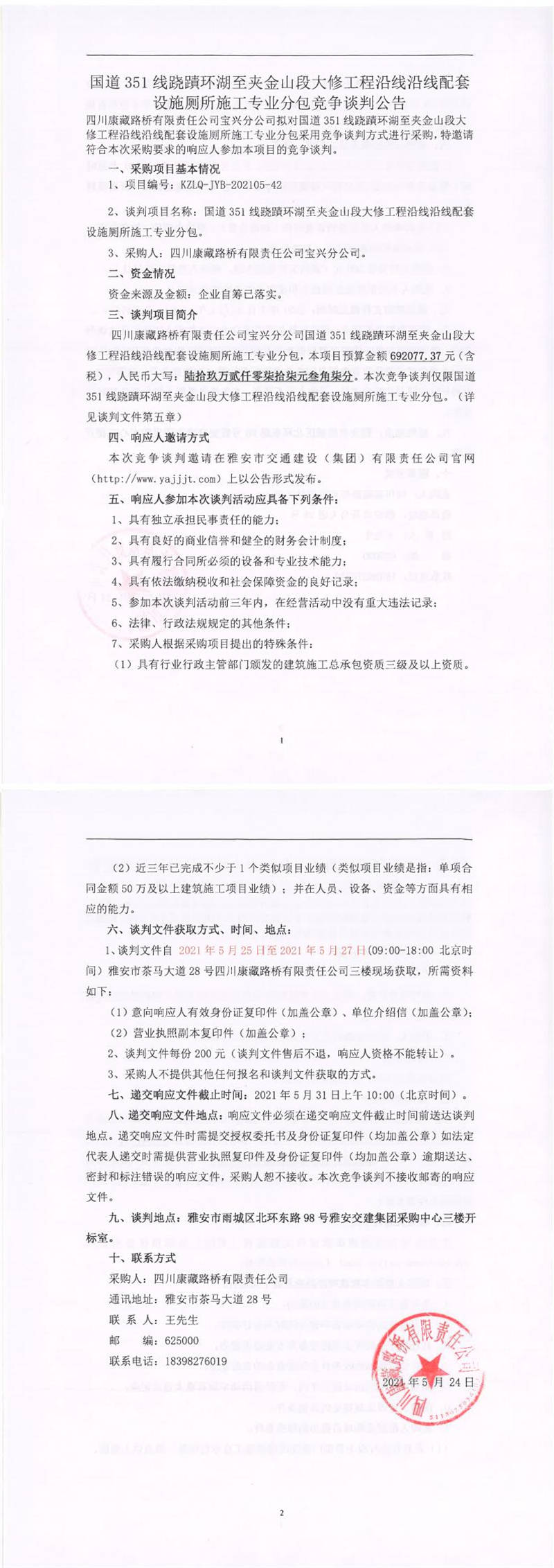四川康藏路橋有限責(zé)任公司寶興分公司國道351線蹺磧環(huán)湖至夾金山段大修工程沿線沿線配套設(shè)施廁所施工專業(yè)分包競(jìng)爭(zhēng)談判公告