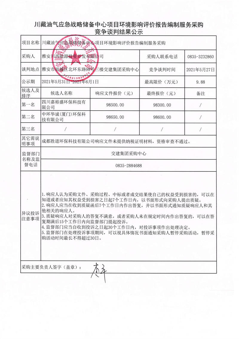 雅安川西能源投資開(kāi)發(fā)有限公司川藏油氣應(yīng)急戰(zhàn)略?xún)?chǔ)備中心項(xiàng)目環(huán)境影響評(píng)價(jià)報(bào)告編制服務(wù)采購(gòu)競(jìng)爭(zhēng)性談判結(jié)果公示