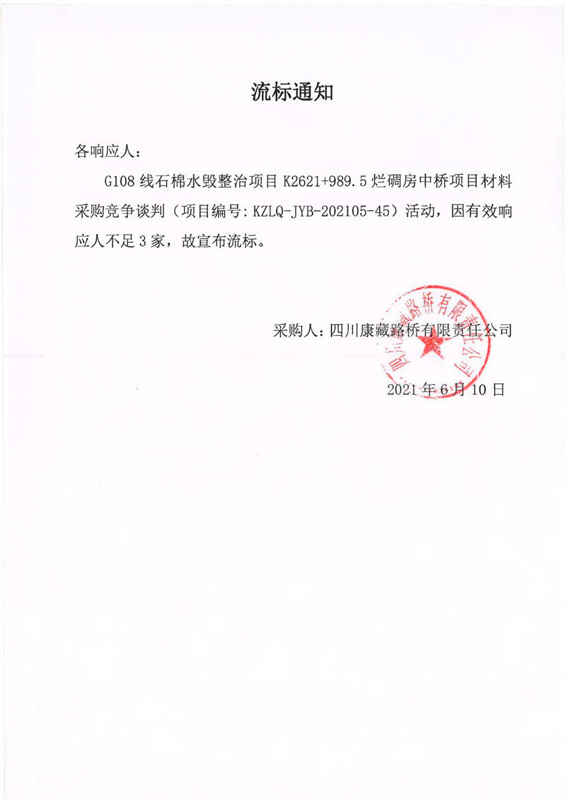 四川康藏路橋有限責(zé)任公司G108線石棉水毀整治項(xiàng)目K2621+989.5爛碉房中橋項(xiàng)目材料采購競爭談判流標(biāo)通知