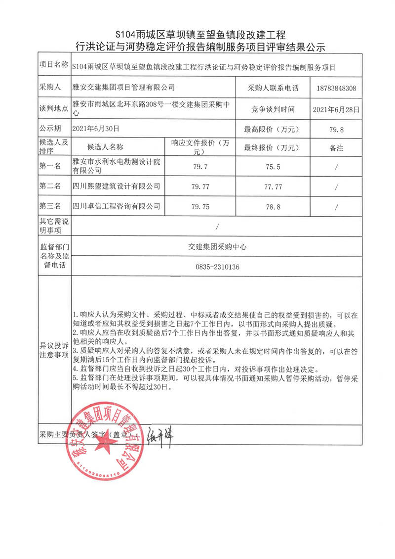 雅安交建集團(tuán)項(xiàng)目管理有限公司S104雨城區(qū)草壩鎮(zhèn)至望魚鎮(zhèn)段改建工程行洪論證與河勢穩(wěn)定評價報告編制服務(wù)項(xiàng)目評審結(jié)果公示