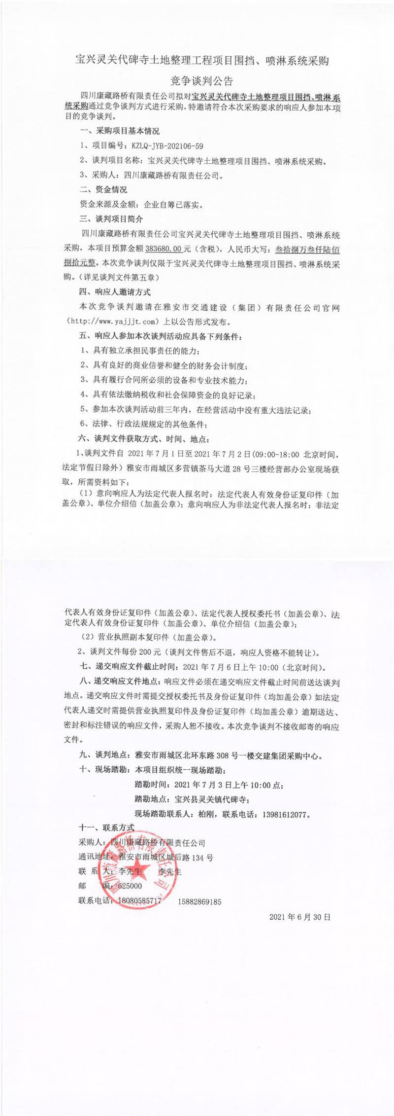 四川康藏路橋有限責任公司寶興靈關(guān)代碑寺土地整理工程項目圍擋、噴淋系統(tǒng)采購競爭談判公告