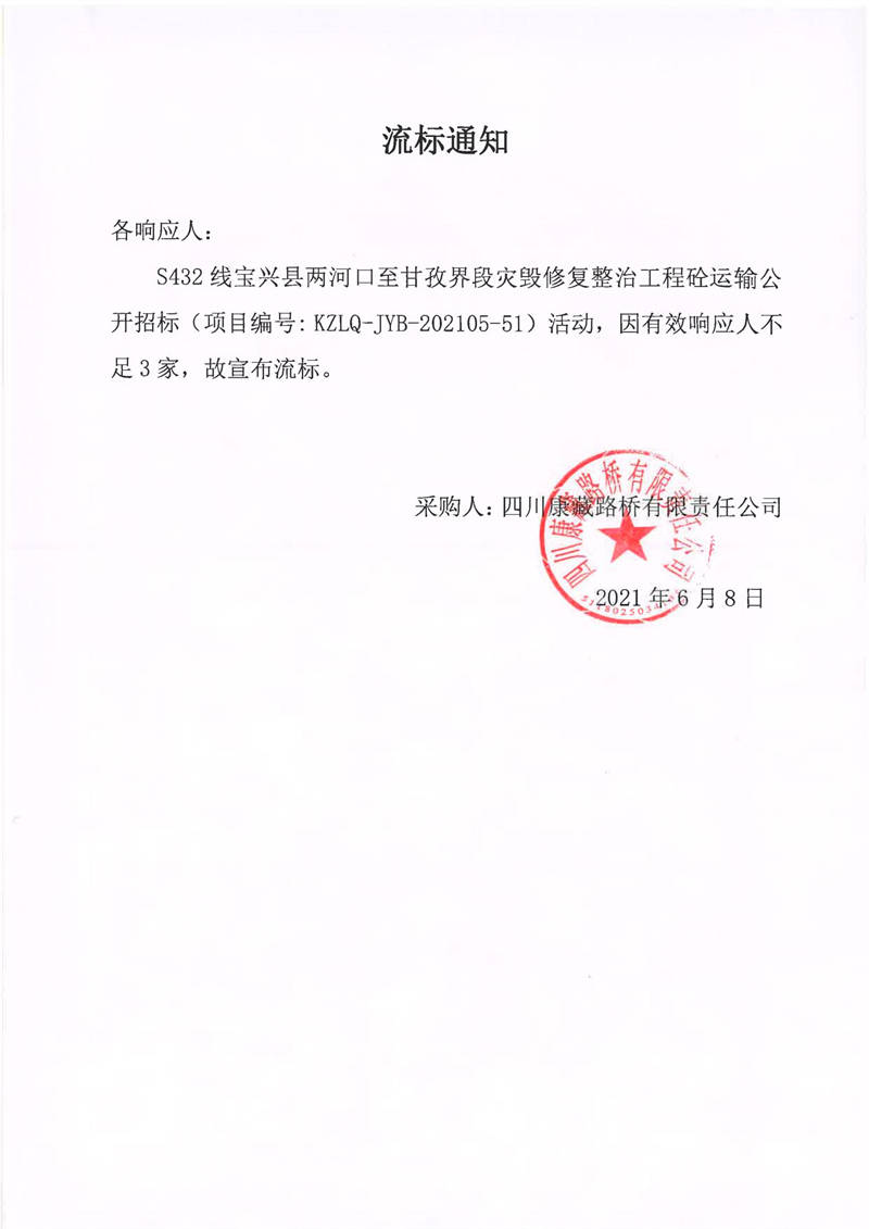 四川康藏路橋有限責(zé)任公司S432線寶興縣兩河口至甘孜界段災(zāi)毀修復(fù)整治工程砼運輸流標通知