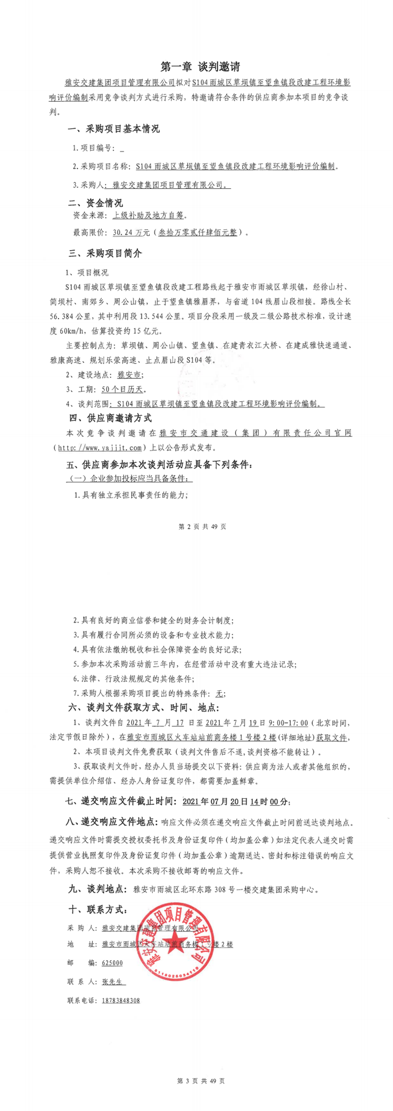 雅安交建集團(tuán)項(xiàng)目管理有限公司S104雨城區(qū)草壩鎮(zhèn)至望魚段改建工程環(huán)境影響評(píng)價(jià)編制競(jìng)爭談判公告