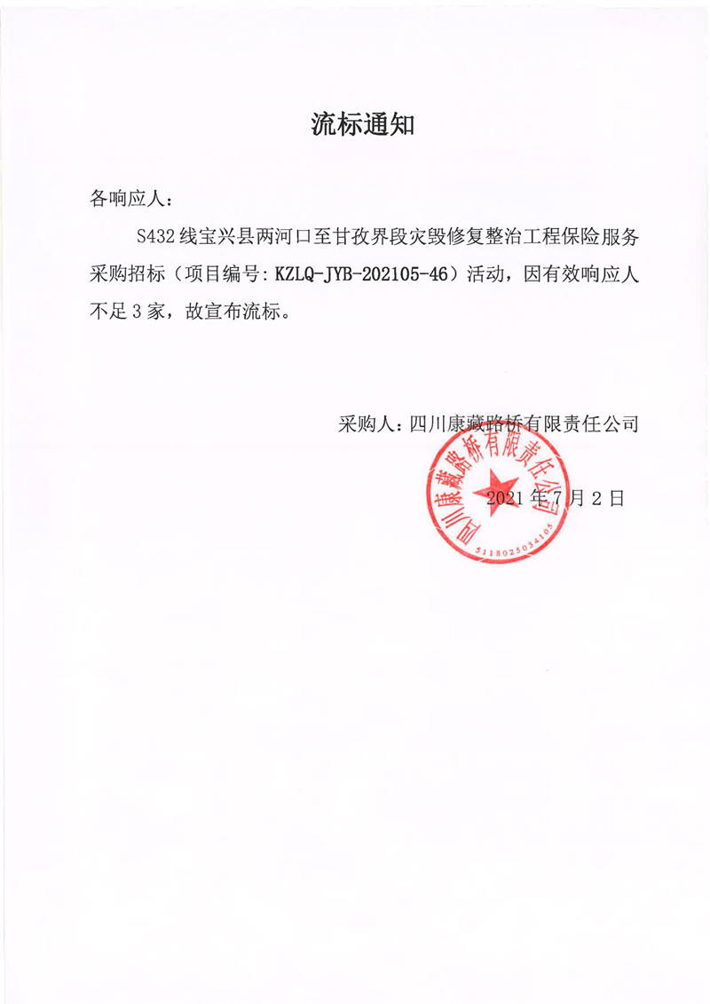 四川康藏路橋有限責(zé)任公司S432線寶興縣兩河口至甘孜界段災(zāi)毀修復(fù)整治工程保險服務(wù)采購流標通知