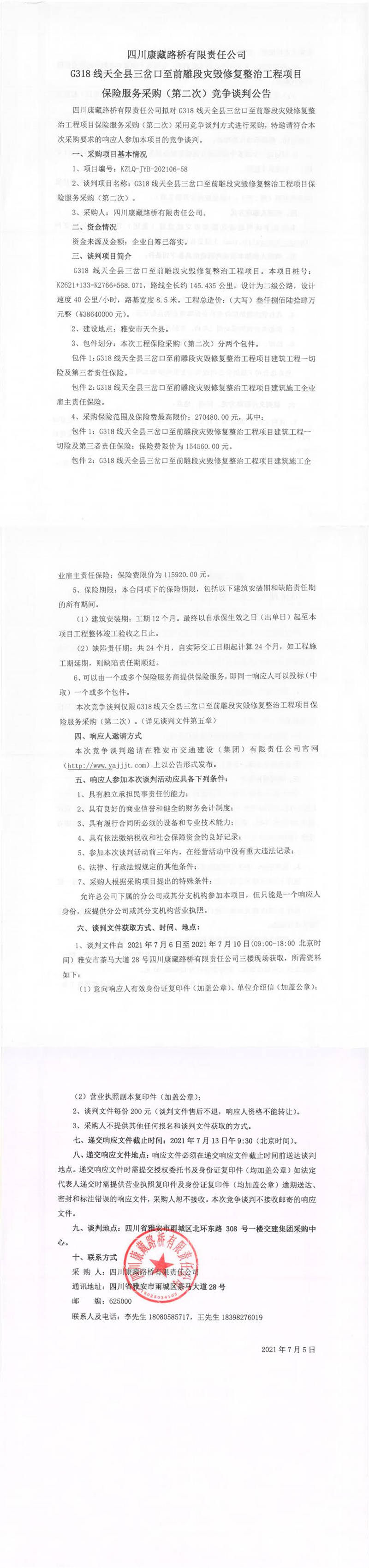 四川康藏路橋有限責(zé)任公司G318線天全縣三岔口至前雕段災(zāi)毀修復(fù)整治工程項(xiàng)目保險(xiǎn)服務(wù)采購(第二次)競爭談判公告