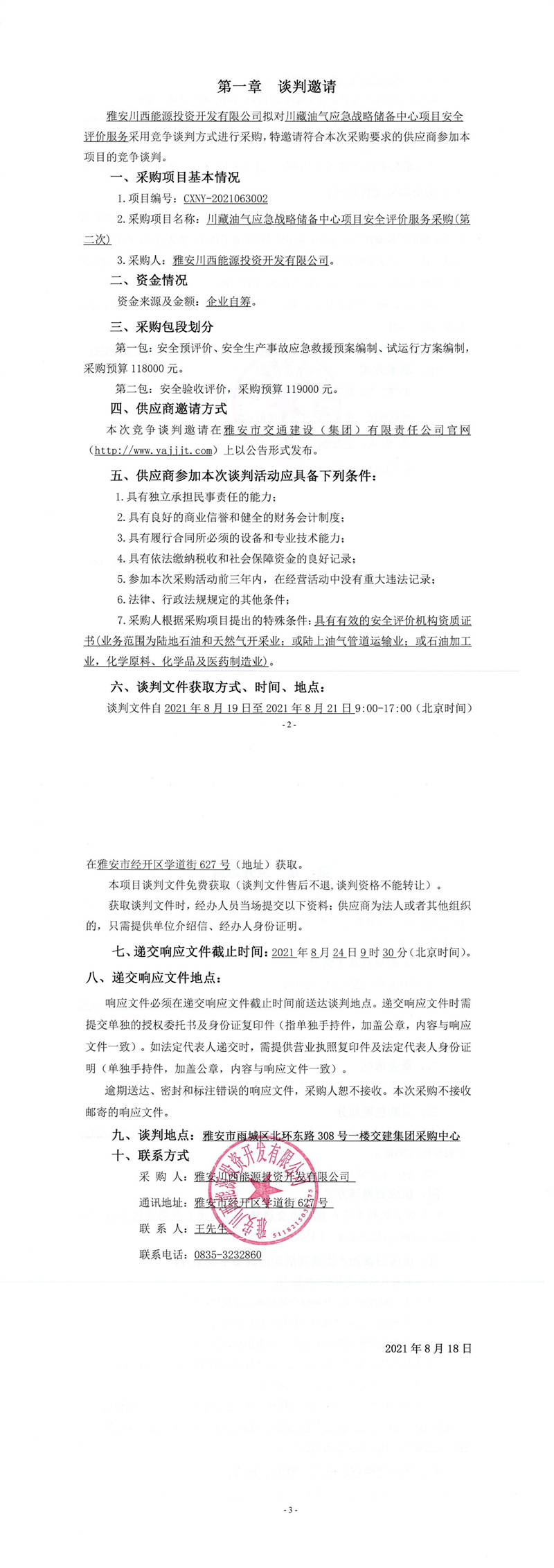 雅安川西能源投資開發(fā)有限公司川藏油氣應急戰(zhàn)略儲備中心項目安全評價服務采購(第二次)競爭談判公告