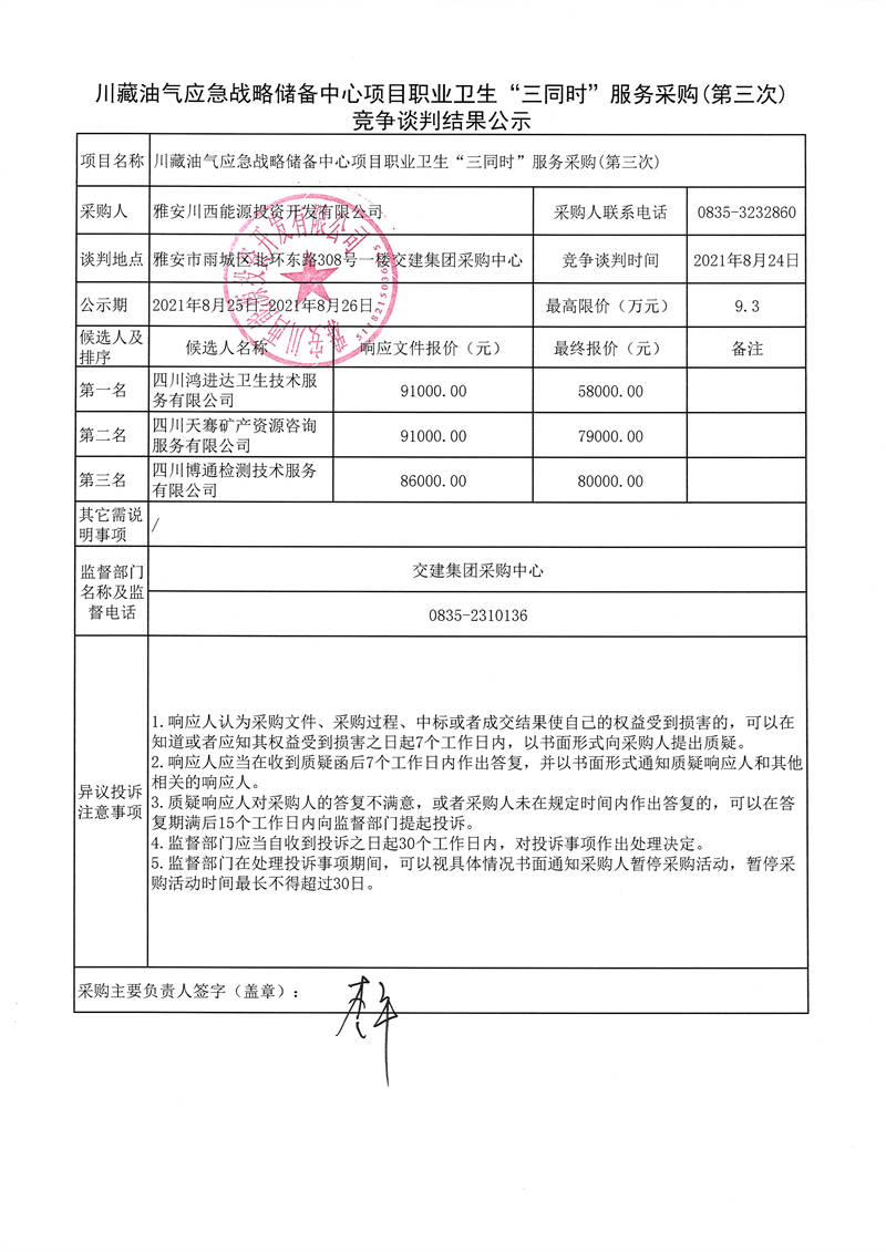 雅安川西能源投資開發(fā)有限公司川藏油氣應(yīng)急戰(zhàn)略儲(chǔ)備中心項(xiàng)目職業(yè)衛(wèi)生“三同時(shí)”服務(wù)采購(第三次)競(jìng)爭談判結(jié)果公示