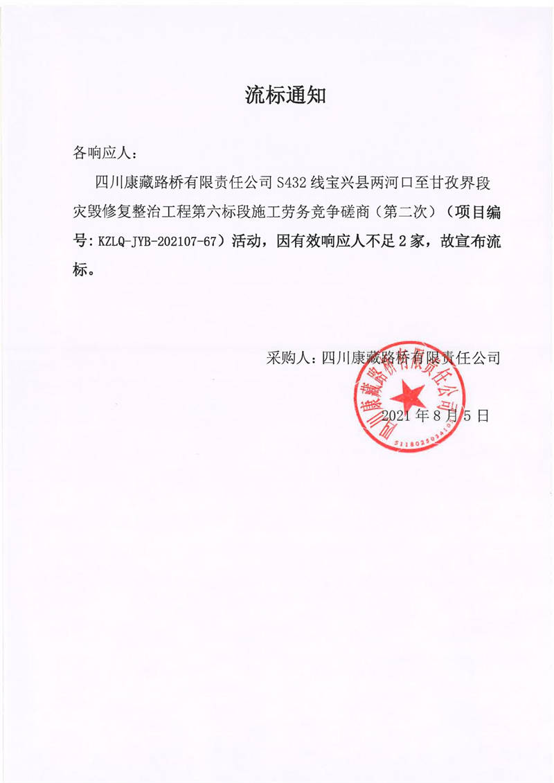 四川康藏路橋有限責任公司S432線寶興縣兩河口至甘孜界段災毀修復整治工程第六標段施工勞務競爭磋商(第二次)流標通知