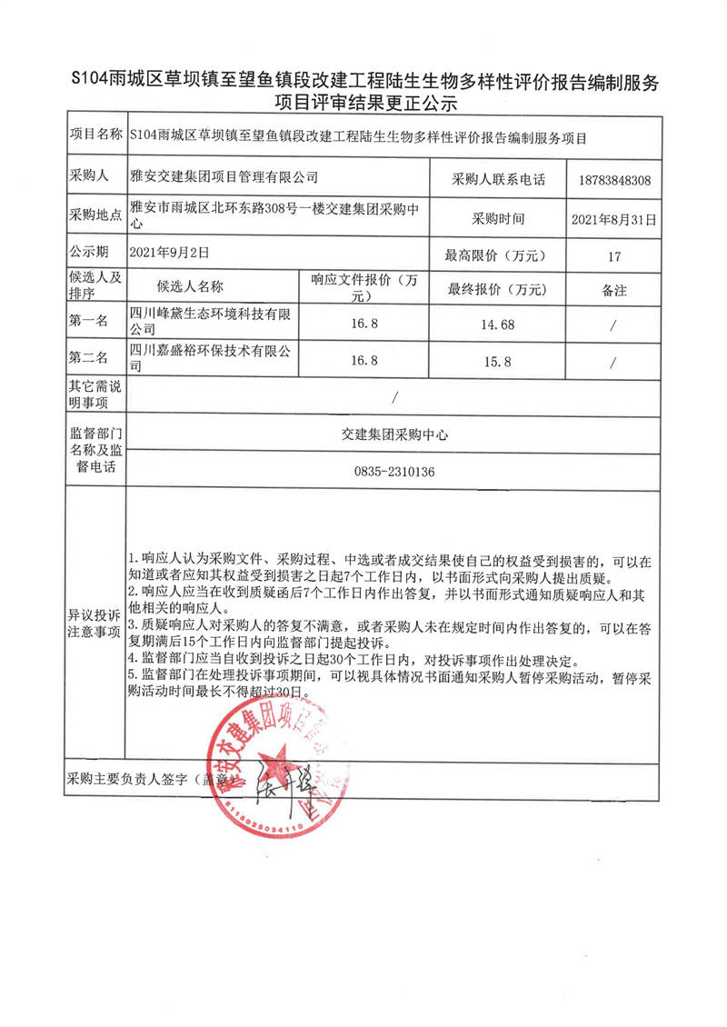 雅安交建集團項目管理有限公司S104雨城區(qū)草壩鎮(zhèn)至望魚鎮(zhèn)段改建工程陸生生物多樣性評價報告編制服務項目評審結(jié)果更正公示