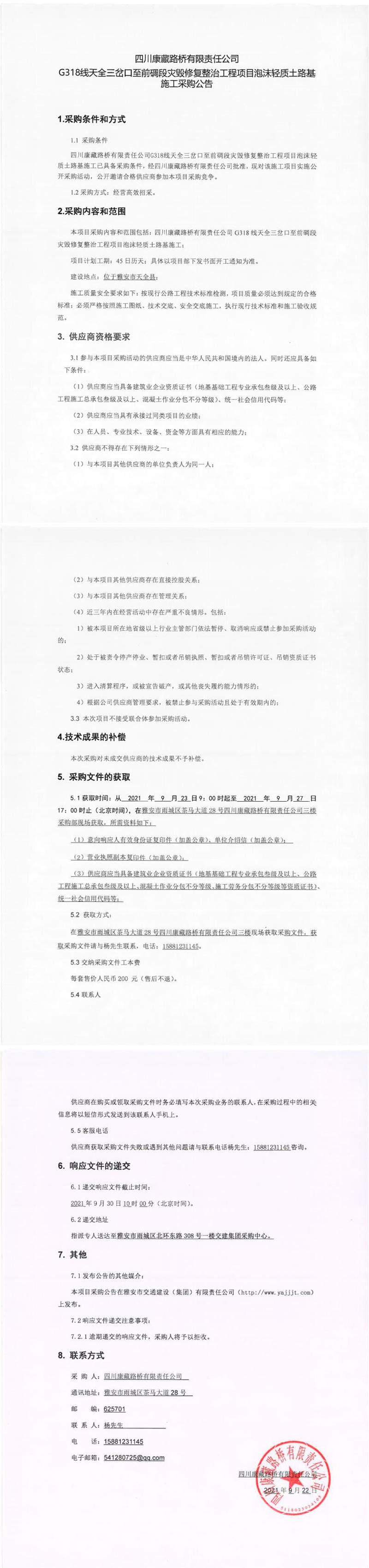 四川康藏路橋有限責(zé)任公司G318線天全三岔口至前碉段災(zāi)毀修復(fù)整治工程項(xiàng)目泡沫輕質(zhì)土路基施工采購公告