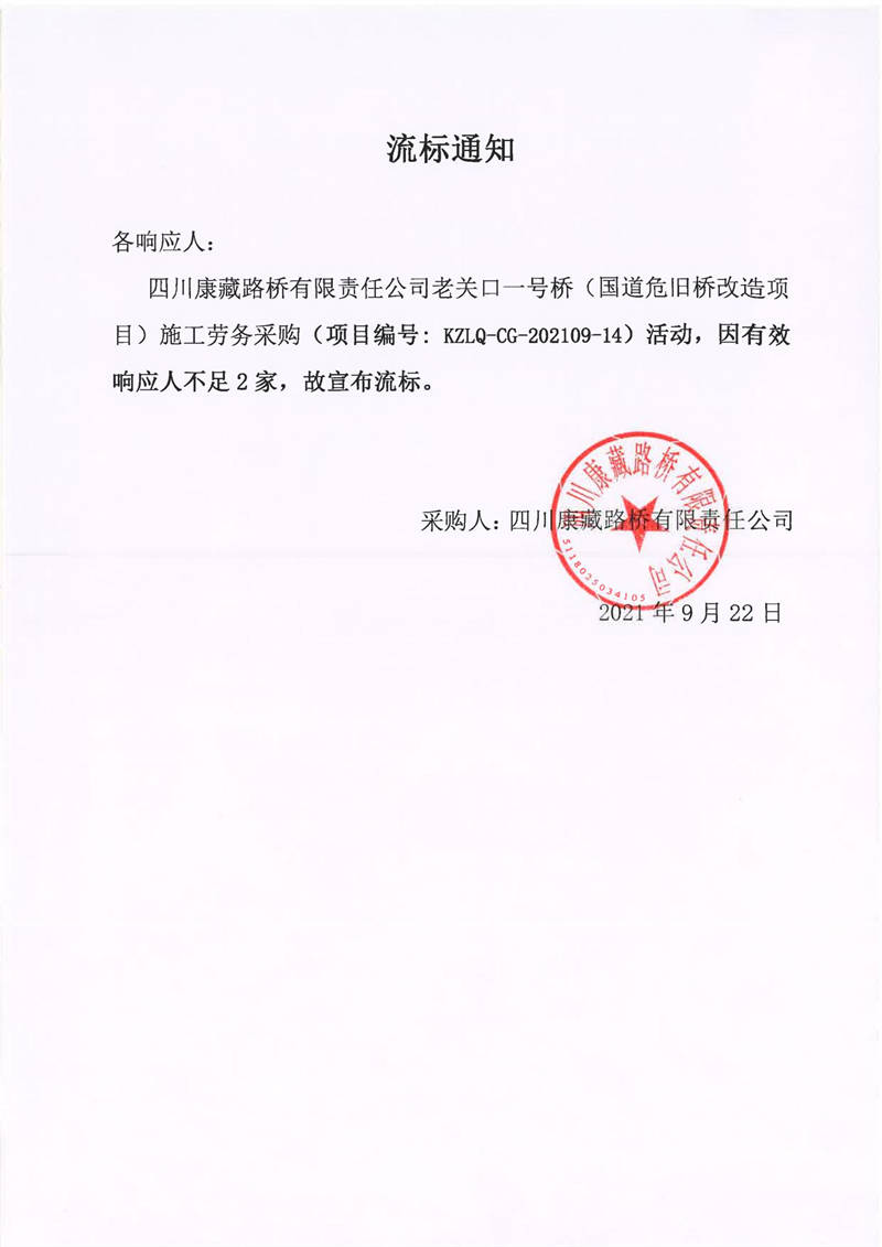 四川康藏路橋有限責(zé)任公司老關(guān)口一號橋(國道危舊橋改造項(xiàng)目)施工勞務(wù)采購流標(biāo)通知