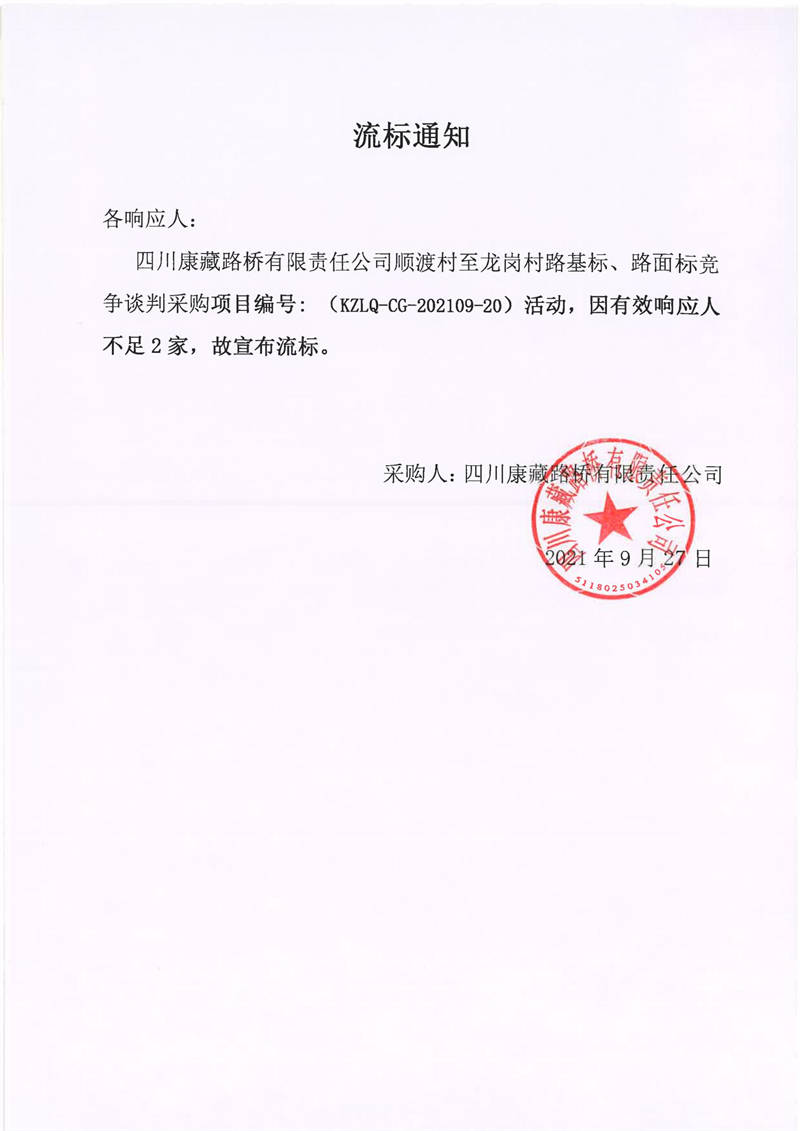 四川康藏路橋有限責(zé)任公司順渡村至龍崗村路基標(biāo)、路面標(biāo)競爭談判采購項目流標(biāo)通知