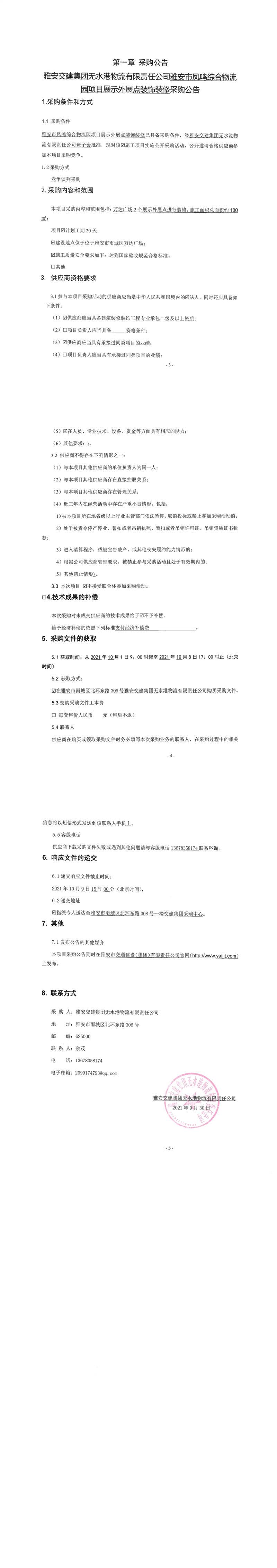 雅安交建集團(tuán)無水港物流有限責(zé)任公司雅安市鳳鳴綜合物流園項目展示外展點裝飾裝修采購公告