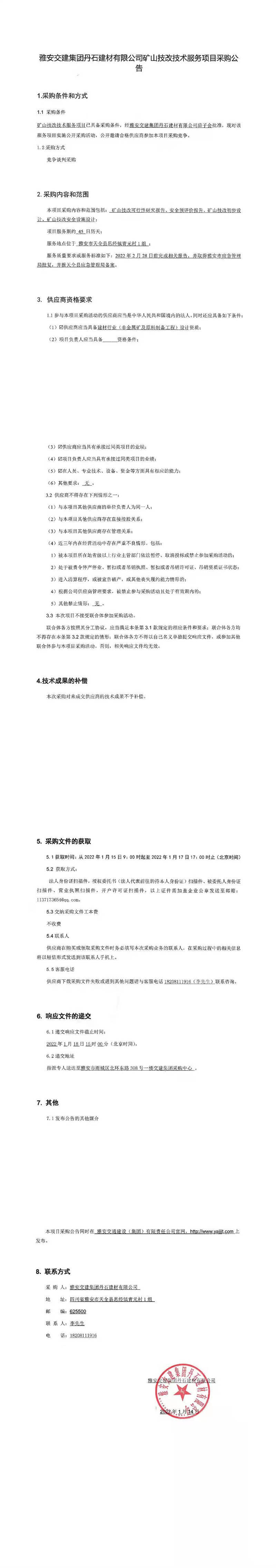 雅安交建集團(tuán)丹石建材有限公司礦山技改技術(shù)服務(wù)項(xiàng)目采購(gòu)公告