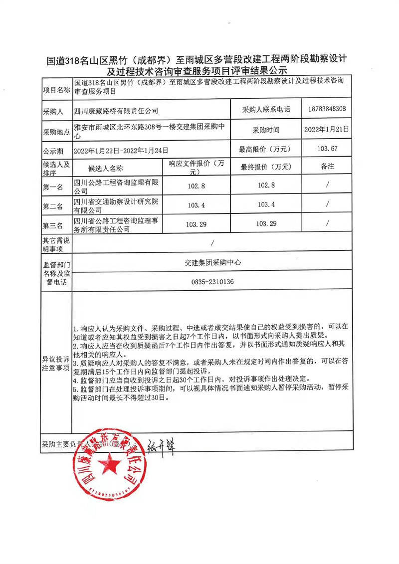 四川康藏路橋有限責任公司國道318名山區(qū)黑竹(成都界)至雨城區(qū)多營段改建工程兩階段勘察設計及過程技術咨詢審查服務項目評審結果公示