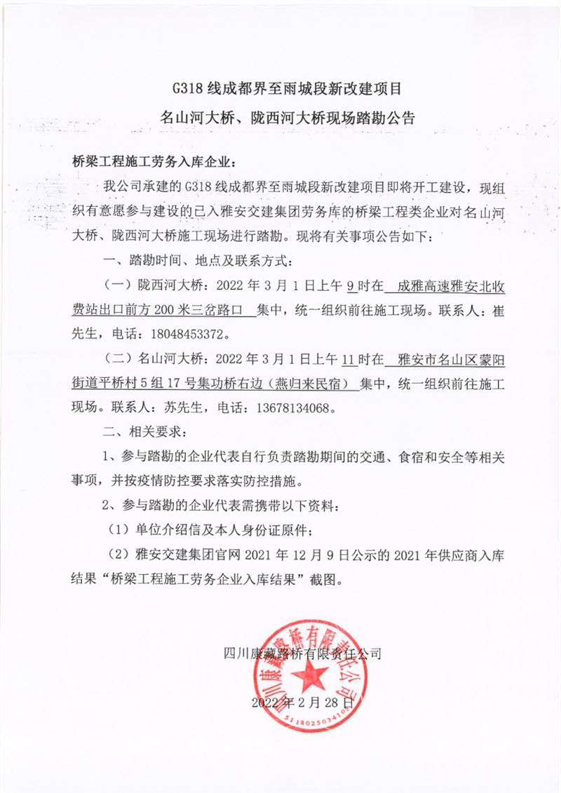 四川康藏路橋有限責(zé)任公司G318線成都界至雨城段新改建項(xiàng)目名山河大橋、隴西河大橋現(xiàn)場踏勘公告