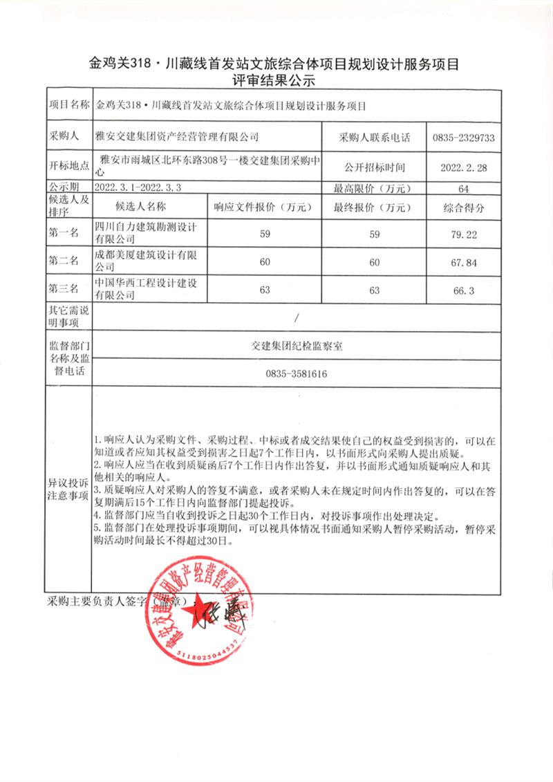 雅安交建集團(tuán)資產(chǎn)經(jīng)營管理有限公司金雞關(guān)318.川藏線首發(fā)站文旅綜合體項(xiàng)目規(guī)劃設(shè)計(jì)服務(wù)項(xiàng)目評審結(jié)果公示