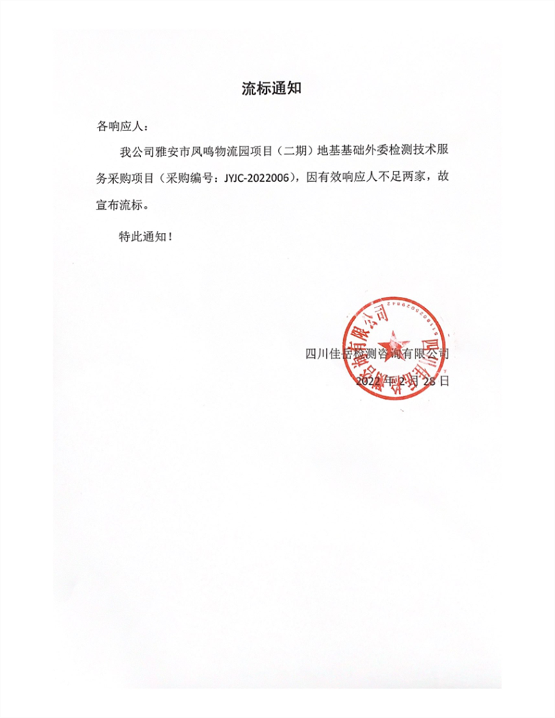 四川佳岳檢測(cè)咨詢有限公司雅安市鳳鳴物流園項(xiàng)目(二期)地基基礎(chǔ)外委檢測(cè)技術(shù)服務(wù)采購(gòu)項(xiàng)目流標(biāo)通知