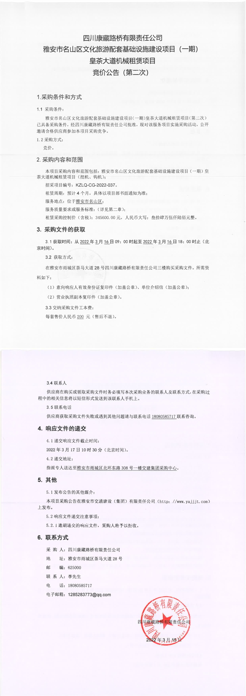 四川康藏路橋有限責(zé)任公司雅安市名山區(qū)文化旅游配套基礎(chǔ)設(shè)施建設(shè)項(xiàng)目(一期)皇茶大道機(jī)械租賃項(xiàng)目競價公告(第二次)