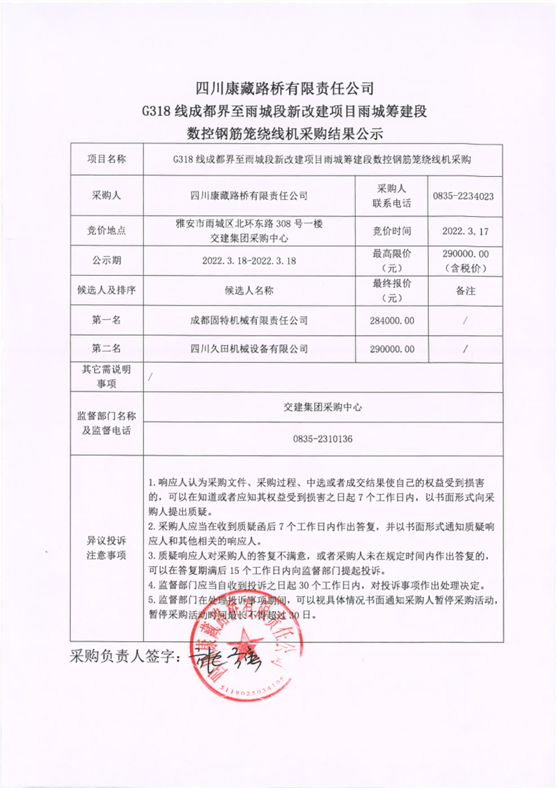 四川康藏路橋有限責(zé)任公司G318線成都界至雨城段新改建項目雨城籌建段數(shù)控鋼筋籠繞線機采購結(jié)果公示