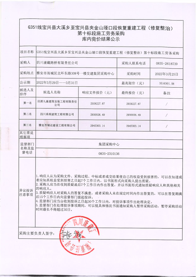 四川康藏路橋有限責(zé)任公司寶興分公司G351線寶興縣大溪鄉(xiāng)至寶興縣夾金山埡口段恢復(fù)重建工程(修復(fù)整治)第十標(biāo)段施工勞務(wù)采購庫內(nèi)競價結(jié)果公示