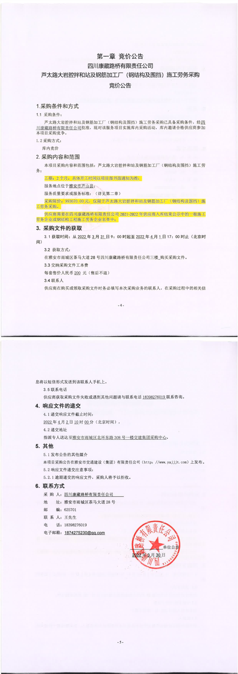 四川康藏路橋有限責(zé)任公司蘆太路大巖腔拌和站及鋼筋加工廠(chǎng)(鋼結(jié)構(gòu)及圍檔)施工勞務(wù)采購(gòu)競(jìng)價(jià)公告