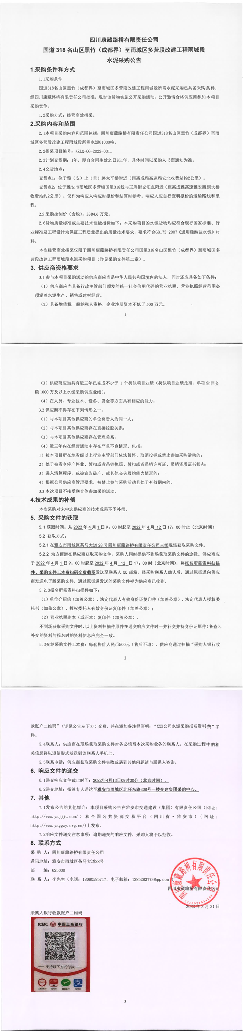 四川康藏路橋有限責(zé)任公司國(guó)道318名山區(qū)黑竹(成都界)至雨城區(qū)多營(yíng)段改建工程雨城段水泥采購(gòu)公告