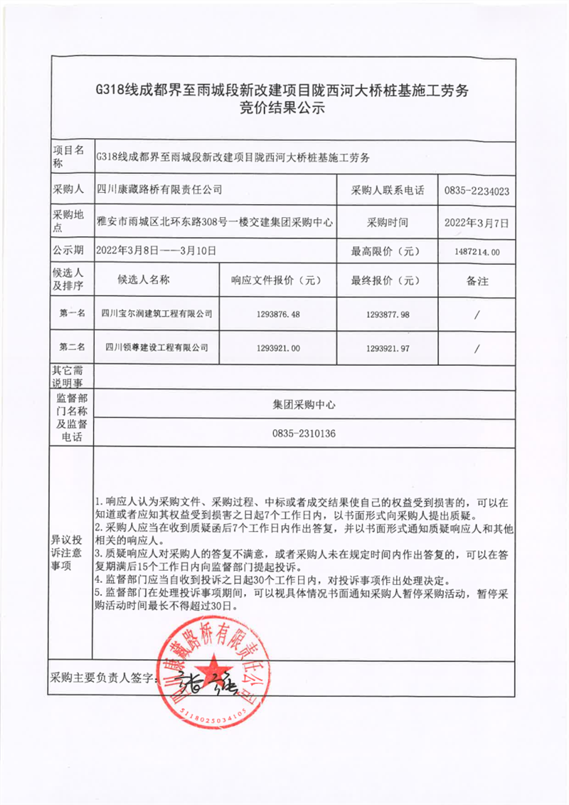 四川康藏路橋有限責任公司G318線成都界至雨城段新改建項目隴西河大橋樁基施工勞務競價結(jié)果公示