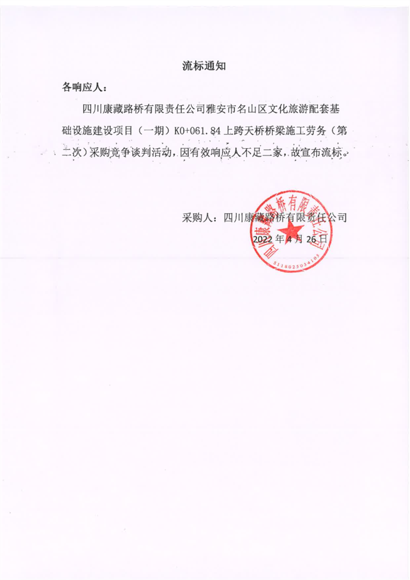 四川康藏路橋有限責任公司雅安市名山區(qū)文化旅游配套基礎設施建設項目(一期)K0+061.84上跨天橋橋梁施工勞務(第二次)流標通知
