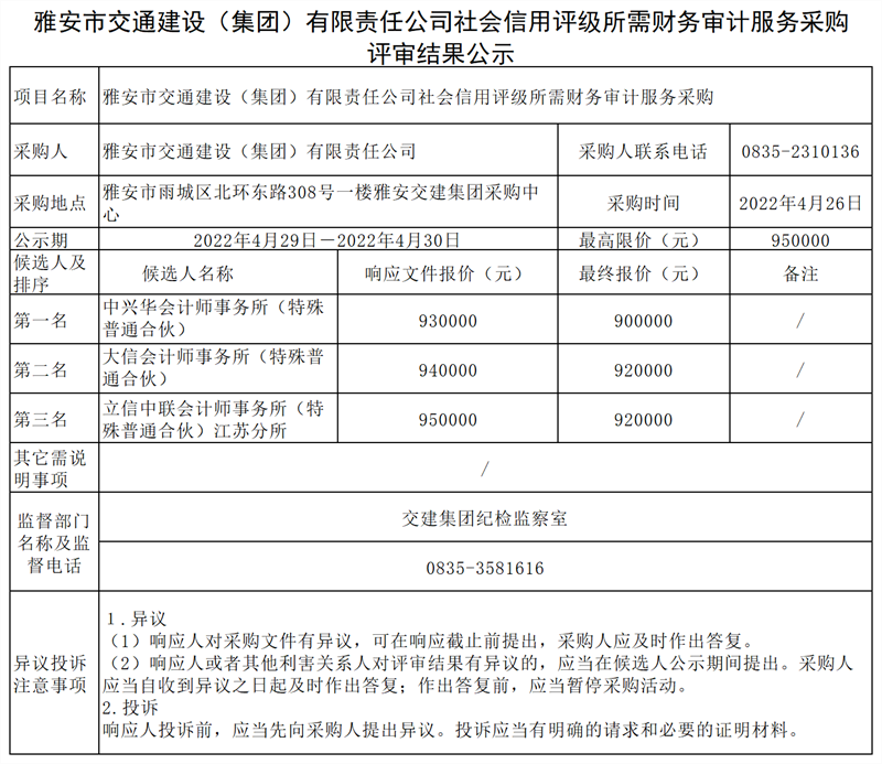 雅安市交通建設(shè)(集團(tuán))有限責(zé)任公司社會(huì)信用評級所需財(cái)務(wù)審計(jì)服務(wù)采購評審結(jié)果公示
