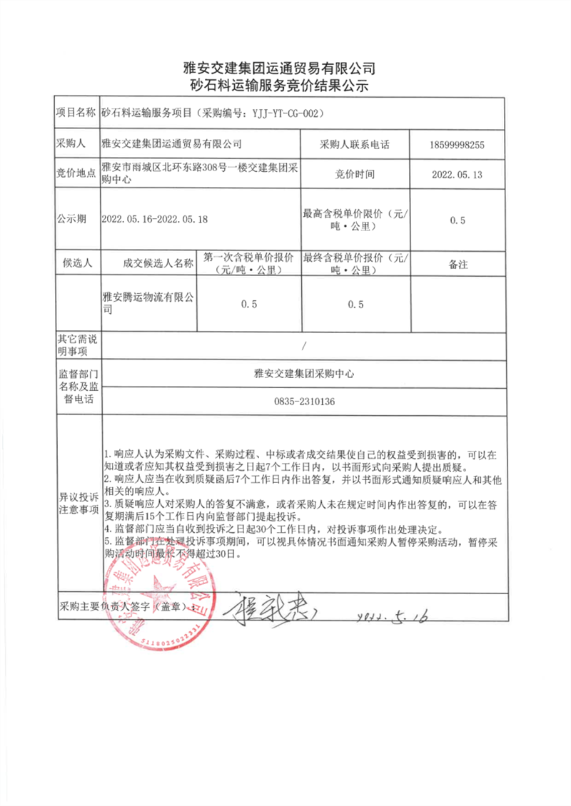雅安交建集團(tuán)運(yùn)通貿(mào)易有限公司砂石料運(yùn)輸服務(wù)競價(jià)結(jié)果公示