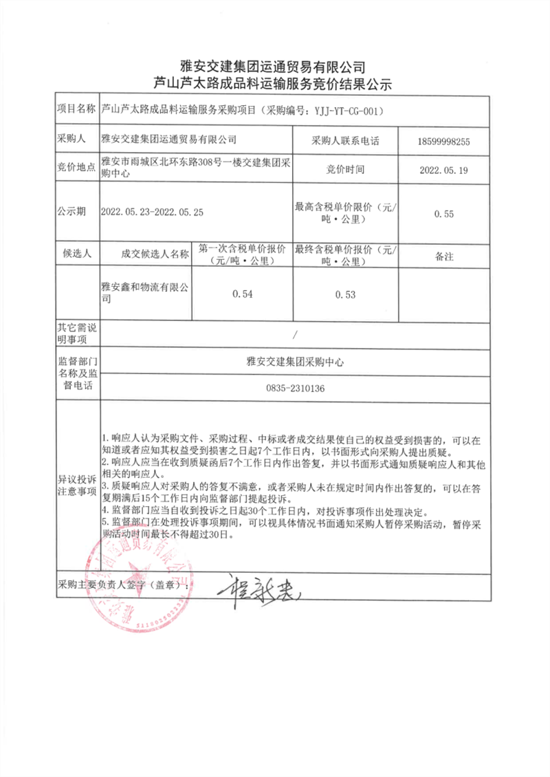 雅安交建集團(tuán)運(yùn)通貿(mào)易有限公司蘆山蘆太路成品料運(yùn)輸服務(wù)競(jìng)價(jià)結(jié)果公示